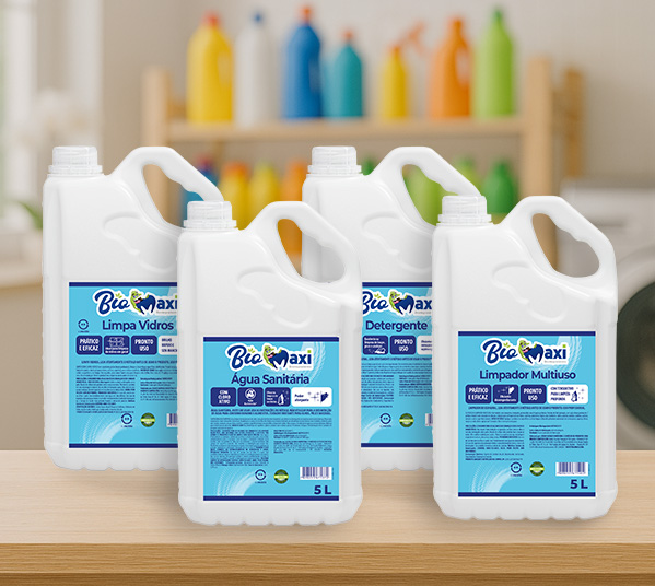 A linha de produtos de limpeza BioMaxi com embalagens biodegradáveis foi desenvolvida para unir eficiência e responsabilidade ambiental. Com opções como água sanitária, desinfetante, detergente, limpador multiuso e limpa-vidros, oferece alto poder de limpeza, praticidade e cuidado com o meio ambiente.