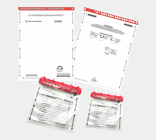 O envelope de segurança biodegradável é fabricado em polietileno ou polipropileno coextrusado, transparente e impresso em flexografia. Possui lacre plástico com pinos de travamento duplo e cápsulas de encaixe, garantindo fechamento seguro e resistente a violações, além de armazenamento prolongado e sustentável.